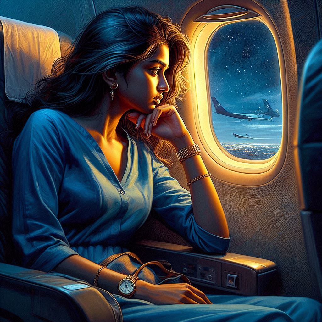 அவள் வானின் உயரத்தில் பறந்து கொண்டிருந்தாள். ஜன்னல் வழியே அந்த ஆடம்பரமான நகரத்தை எட்டிப் பார்த்தாள். எங்கும் நிரம்பியிருந்த விளக்குகள் பூமியில் நட்சத்திரங்கள் மின்னுவதாய் தோன்றியது.